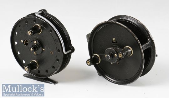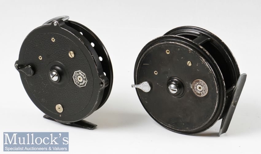 Allcocks Match Special 4” centrepin reel in black mottled finish, dimple handles, with reversible line guide, signs of light use, otherwise runs smooth together with a J W Young & Son Freedex 4” centrepin reel in black, with light signs of use, runs smooth overall (2)