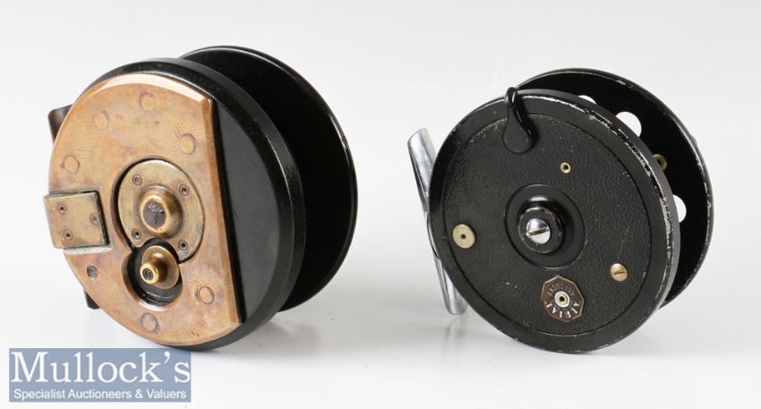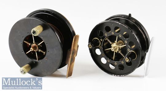 Allcocks 4” bakelite sea reel with crack to rear, brass support to back, on/off check, brass foot, runs well, together with a 3 ¾” centre pin reel in black, chrome foot, slight wobble, spins ok (2)