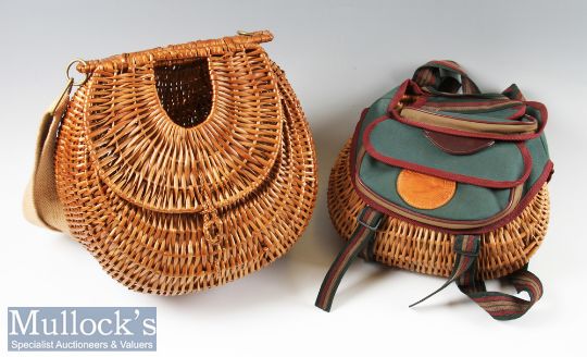 Nice wicker water melon style fishing creel with slot to lid, 30x 27x 36cm approx, with canvas shoulder strap appears in good overall condition together with a Salix Alba trout creel measuring 30x12x30cm approx., some broken wicker to ends, otherwise still useable (2)
