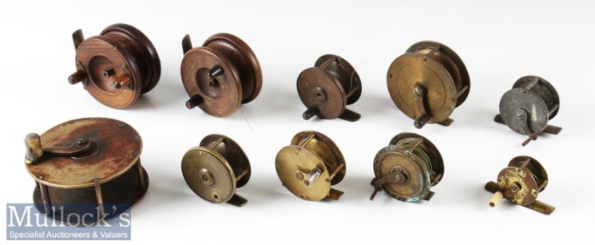 Selection of 8x assorted brass fly reels in varying sizes, plus 2x Nottingham wooden reels with star and strap backs, the brass reels are unnamed apart from a 2 ¼” A W Gamages Holburn reel, various conditions (10)
