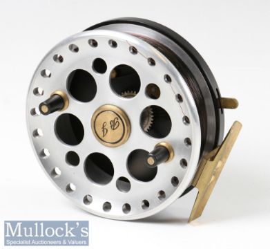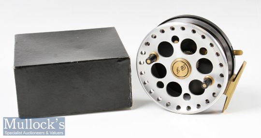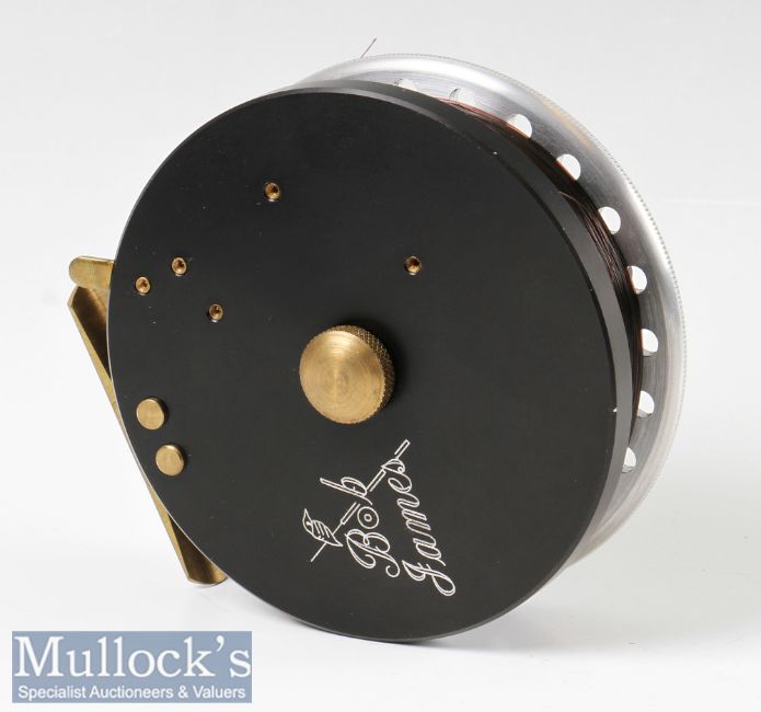 Fine Bob James 4 ½” alloy centrepin reel with rim on/off check, spins forever, in very good condition, with box and leaflet