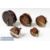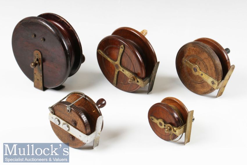 5x various wooden reels mostly strap back and a star back wood and brass example largest measures 5”, a 4 ½” star back, 4” strap back, 3” wood and alloy strap back and a 2 5/8” brass strap back