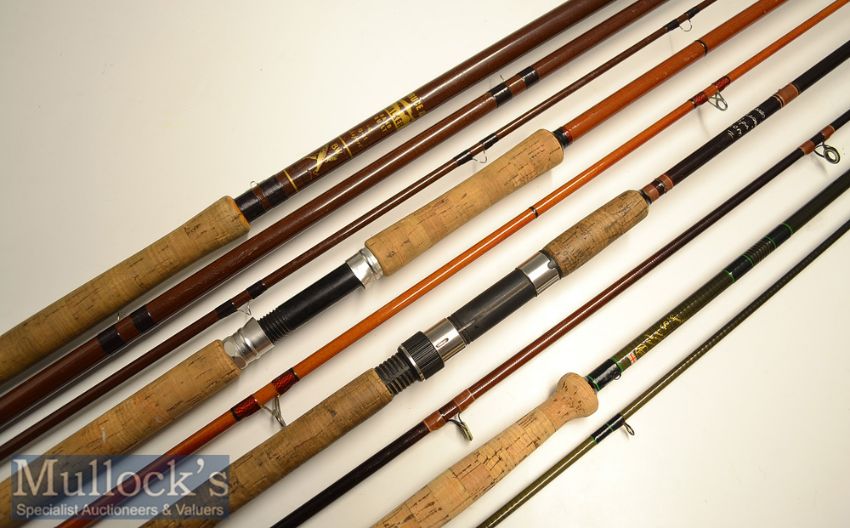 Collection of Salmon and Trout Fly and Spinning rods (4) – Henry W Aiken Ltd London Super Flex S carbon rout fly rod10ft 2pc line7/8# with carbon style screw locking reel fittings lightly used in mob; Bruce& Walker “The Expert” hand built hollow glass salmon fly rod 14ft 3pc line wt 9-11#, soiled cork handle in mob; Lanes Classic Spin Carbon Rod 10ft 2pc with lined guides, soiled cork handle with carbon style screw locking reel fittings in green cloth bag; and an unnamed solid glass spinning rod 8ft 2pc with pink agate lined butt and tip guides - cork handle with alloy screw locking winch fittings – very lightly used