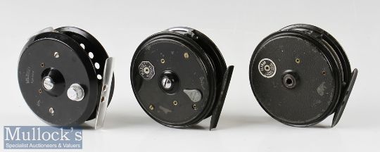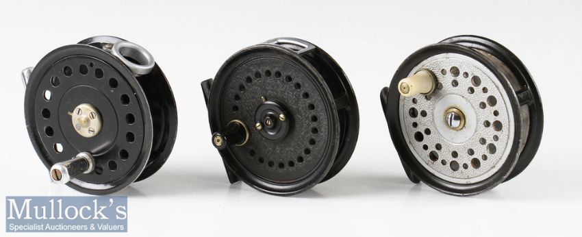 Fly Reel selection to include Allcocks Marvel 3 ½” reel in black finish, dimple handle, Milward 3 ½” Flycraft with O line guide alloy dimple handle, and an Edgar Sealey Flyman 3 3/8” reel all with signs of light use, otherwise run smooth (3)