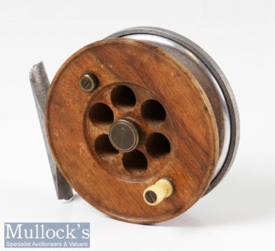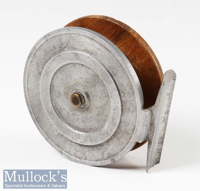 Fine Facile marked 3 1/4” wood and alloy centre pin reel marked Facile to the rear alloy plate, and Facile to centre screw, wood and alloy flange drum with perforated face, counter balance weight, smooth alloy foot with damage to ends, spins well
