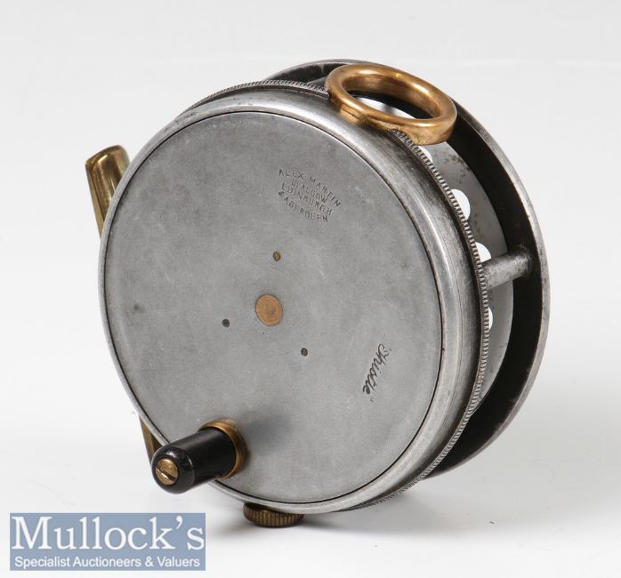 Alex Martin The Thistle 3 ¼” Alloy Perfect Style Salmon Fly Reel, black handle, rim tension regulator, internal twin check with ball bearings, ventilated face, smooth brass foot, retains most original dark lead finish, runs smooth with good check