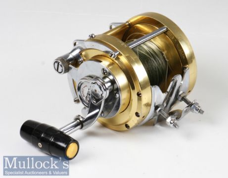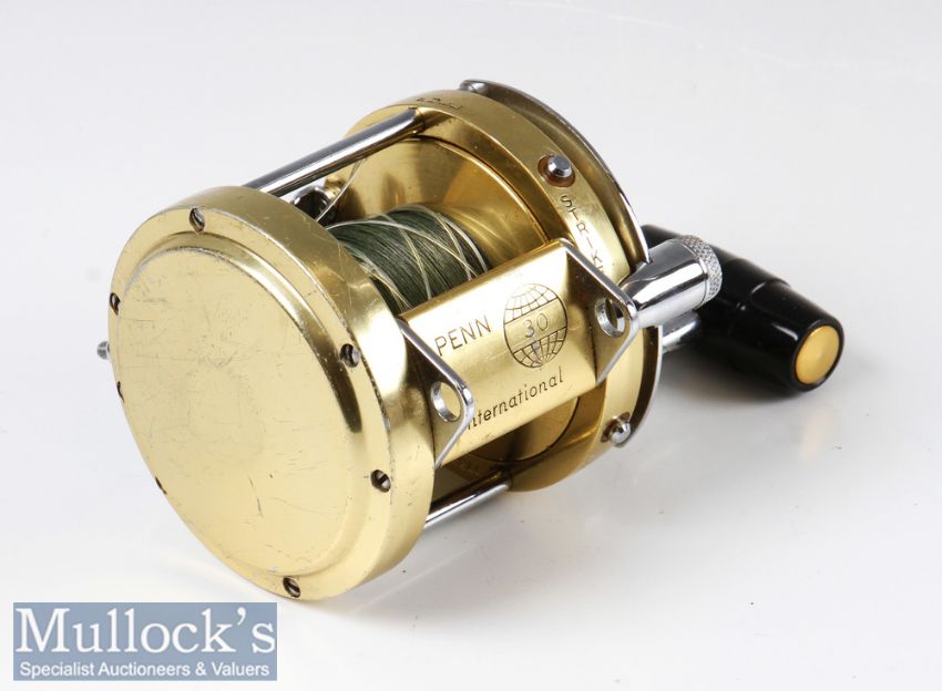Penn 30 International big game multiplier reel finished in gold and chrome, with power handle, harness lugs, appears with light signs of use otherwise in good condition overall