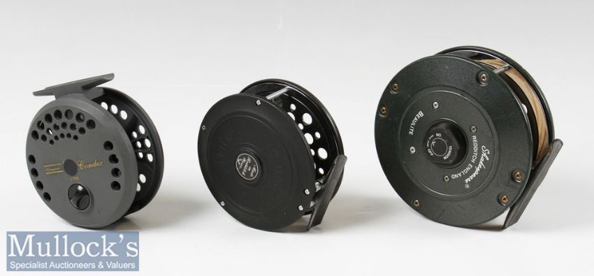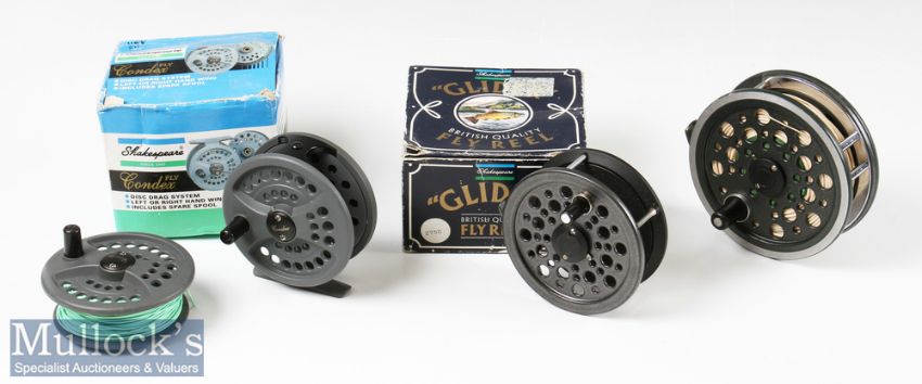 Shakespeare Redditch Beaulite 4 ¼” alloy salmon fly reel loaded with line plus Shakespeare Condex 2766 with spare spool in box and a Shakespeare Glider3 ½” fly reel in box all in good condition overall (3)