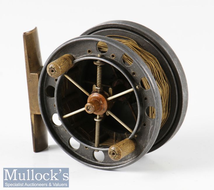 Rare S Allcock Aerial 3” wide spool alloy centre pin reel with maker’s circular logo, reg no 689467, internally stamped 23366, twin handled, six spoke, smooth brass foot, on/off check, spins forever