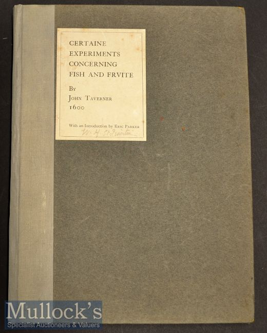 Scarce 17thc Reprint Fishing Book: Taverner, John – “Certaine Experiment Concerning Fish and Frvite; Practised by Iohn Taverner A Gentleman, and by him published for the benefit of others” reprint 1928 of the original printed for William Ponsonby in 1600 - comes with an introduction by Eric Parker in grey boards with grey cloth spine with title label laid to the front, clean internally (G)