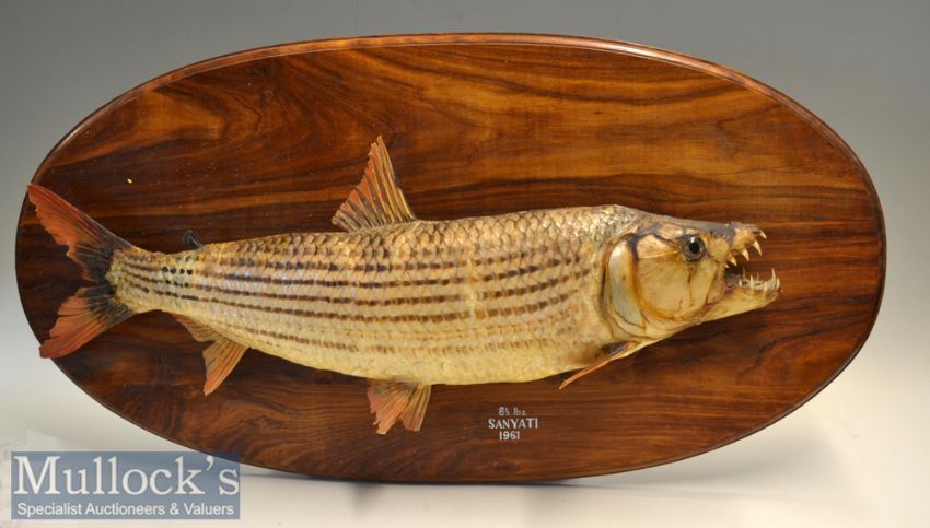 Preserved Tiger Fish – mounted on oval wooden plaque with gilt inscription “8 1/2lbs - Sanyati – 1961” overall 16” x 31”