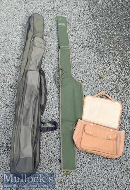 Greys Prodigy 12ft rod holdall / carrier with zipped sections and strap plus an Ultimate Protect 12ft canvas rod carrier in green appears in good condition and a tan leather tackle bag, unnamed with removable lining (3)