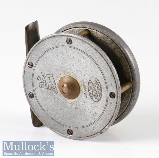 Rare Hardy Bros Alnwick 2 7/8” The Field alloy fly reel, ivorine handle, brass pillars and drum, smooth brass foot, in very good condition