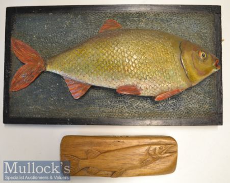 2x Wooden Fish Carvings: Hand painted Roach mounted on wooden plaque overall 6.75” x 12”, and a small wall wooden mounted Pike carved from a single piece of wood with sculptor initials carved into the top of the mount – overall 2” x 6”#