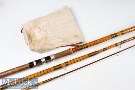 Early Olivers Spanish Reed Coarse Rod: Olivers of Knebworth-whole cane and whole cane spliced tip rod - 15ft 8in 3pc with red agate lined butt and tip guides - 31 ¼ inch trumpet style cork handle (soiled) c/w alloy and black anodised sliding screw locking winch fitting - some slight marks in places but otherwise a stunning looking rod in makers original cloth bag (VG)