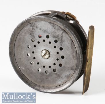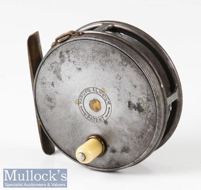 Early check 1911 Hardy Bros Alnwick 3 3/8” perfect alloy fly reel marked W internally to backplate, marked 10 43073 L internally, smooth brass foot, strap tensioner, ivorine handle, surface wear, chip to backplate, heavy wear to rim in places, runs smooth