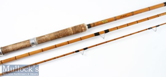 Match Rod: Constable Bromley “Superb” split cane match rod - 12ft 3pc with amber agate lined butt and tip guides - slight knock to one on the mid-section – 25” inch cork handle fitted with alloy sliding reel fittings (some soiling) - original makers gilt oval decal label (2 marks) comes in fitted cloth bag - very presentable (G)