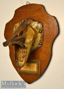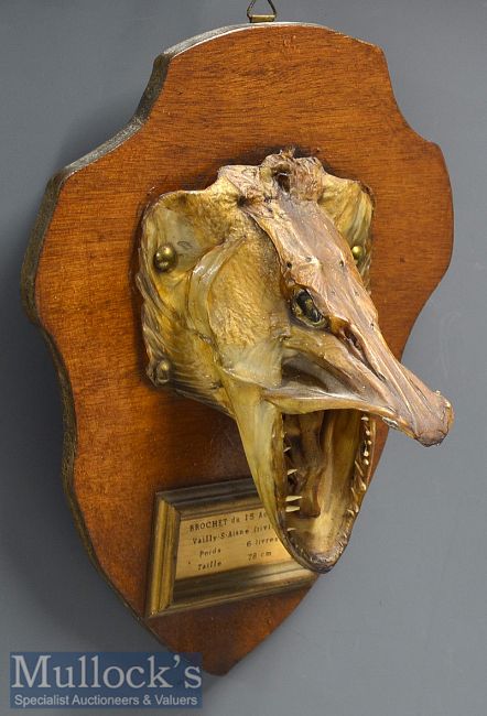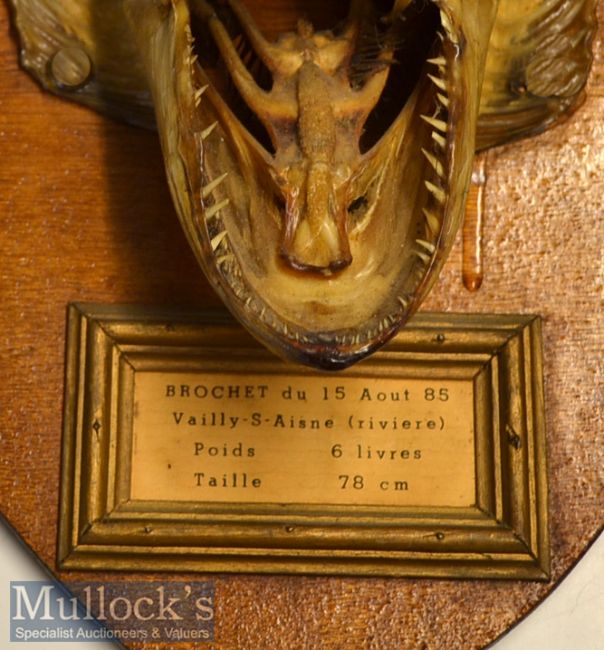 Head of Pike – caught in France - mounted on a shield with small picture frame below with typed inscription “Brochet du 15 Aout ’85- Vailly-S-Aisne (Riviere) – Poids 6 Livre – Taille 78c” – overall 12”x 9.75”