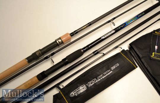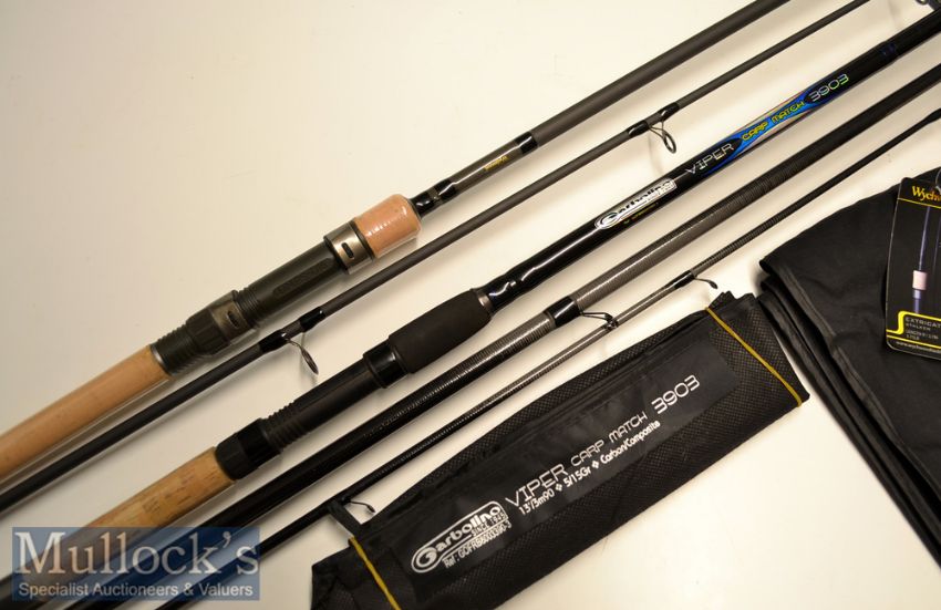 2x very good/unused Carbon Match/Carp Rods – Carbollino “Viper Carp Match 3903” 13ft 3pc c/wt 5/15grm – with fuji style lined guides, 23” Velcro/cork/velcro handle with screw locking reel fittings still with cellophane wrapping – very lightly used in mob; and Wychwood Stalker Extricator 9ft 2pc with fuji lined guides, 21” cellophane wrapped cork handle with DMPS-D18 carbon/alloy screw locking reel fittings – some slight bubble varnish otherwise appears unused in mob c/w labels