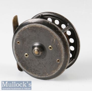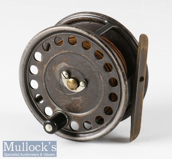 Hardy Bros Alnwick 3.75” Uniqua Dup Mk II wide drum alloy salmon fly reel with smooth brass foot, perforated face, horseshoe latch, surface wear to finish, runs smooth otherwise
