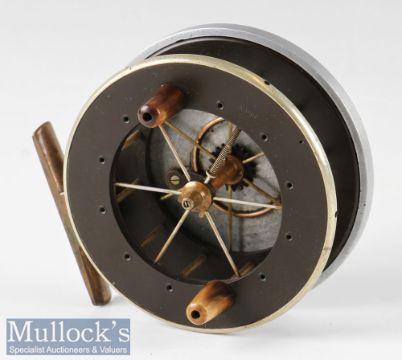 Very Scarce Allcocks ‘Rollerback’ 4 ½” Aerial centre pin reel ebonite and nickel silver bound drum, alloy back with four bronze rollers, stamped ‘patent’ to front, spins forever