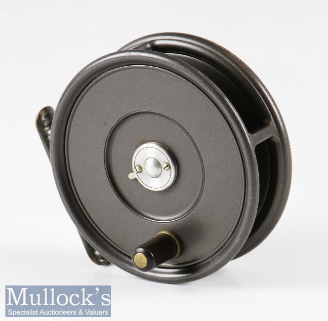Hardy Bros England 3 3/8” Uniqua alloy trout fly reel with ribbed brass foot, two screw quick release latch, signs of very light use, winds smoothly otherwise, overall a good, clean example