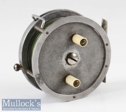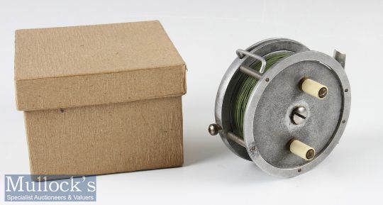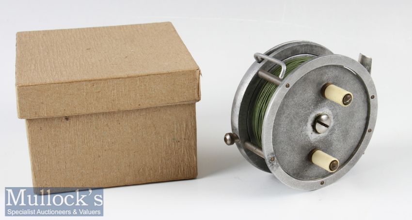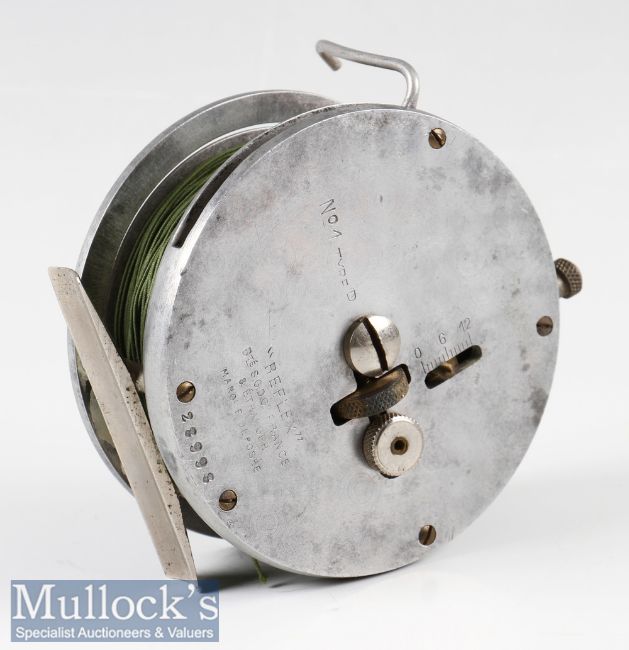 Interesting France stamped The Reflex 3.5” tournament style alloy casting reel - stamped No.1 Type D to the back plate, unusual integral line control lever, nickel on brass frame pillars, smooth alloy foot, rim and back plate brake indicator, adjuster and ratchet to backplate – possibly made by Allcocks of Redditch – stamped with Ser No 2899 to the back plate – spins freely – comes in fitted card board reel box.