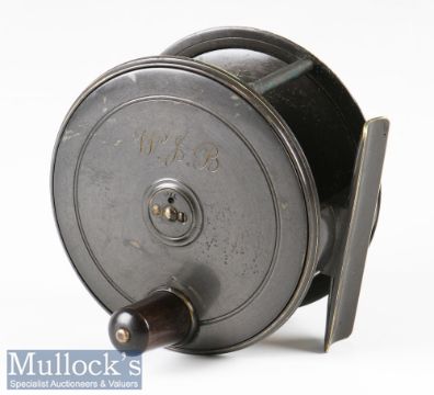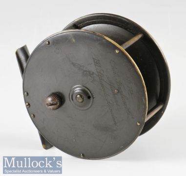 C Farlow London 4 ¼” brass patent lever fly reel with screw styled drag adjuster, four pillar construction, engraved ‘Patent Lever No 712 Chas. Farlow & Co Makers 191 Strand, London’ and initial ‘W J B’ to wind plate, appears G overall