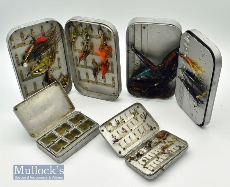 Wheatley Aluminium fly cases and flies to include a Wheatley Silmalloy another with hooks internally, smaller Allcocks tin with hinged compartments and another small Wheatley case with hooks internally, few various flies included (4)