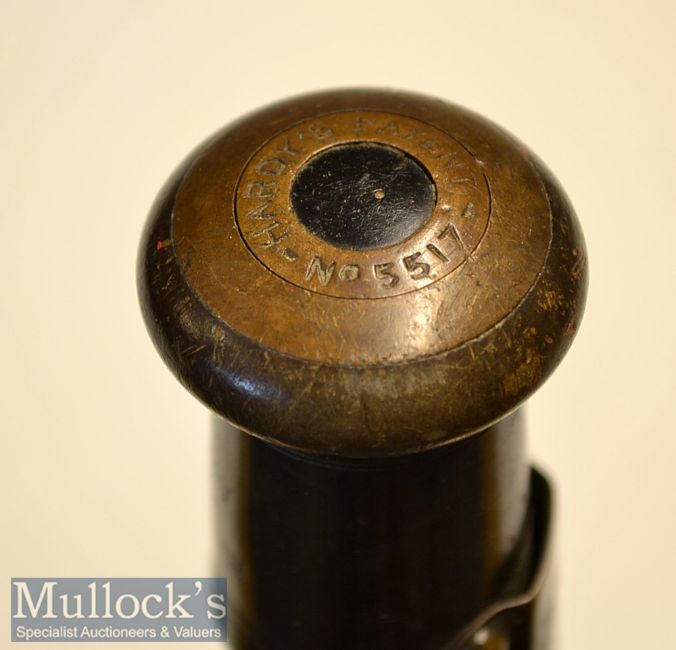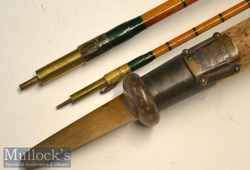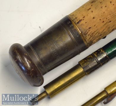 Early Split Cane Trout fly Rod: Hardy Bros Makers Alnwick Serial No. 32374 - 9ft 2in 3pc with possibly shortened midsection and shortened tip - some restoration work, 13 inch cork handle fitted with makers brass reel fittings and butt cap – clean and tidy c/w a brown cloth rod bag. (F)