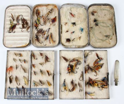 Hardy Bros Rod Butt Spear marked A49540 measures 8.5cm in total together with a selection of aluminium fly cases and flies to include Trout and Salmon flies, few Gut eyed examples, with a Hardy’s case and 3x other unnamed examples (5)