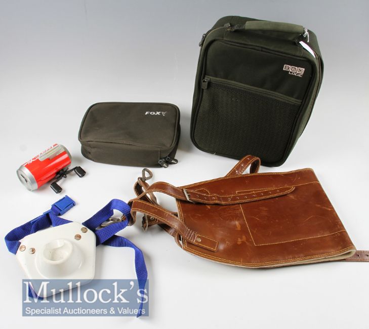Quantity of fishing accessories to include a novelty coca cola fishing reel, selection of various line, a Fox fly bag, a Box Logic pike kit bag, selection of foam floats, wire Lines, various floats, big game leather back brace, fighting harness, cigarette cards, reels cards etc (Qty) Box