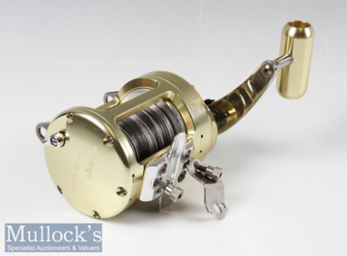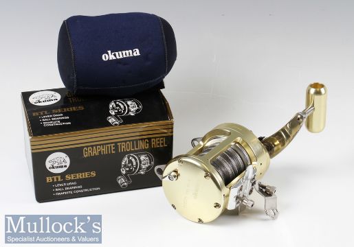 Okuma Titus TG 30 II graphite trolling reel in gold finish with lever drag, marked T2106 with neoprene case and a box, runs smooth