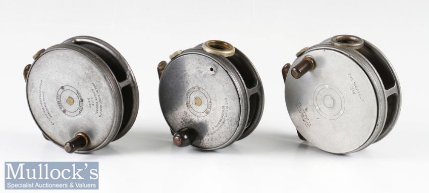 Hardy Bros England perfect alloy fly reels sizes include 3 3/8” x2 and a 3 1/8” all with brass ribbed feet, one agate line guide, another O line guide, all with faults, A/F (3)