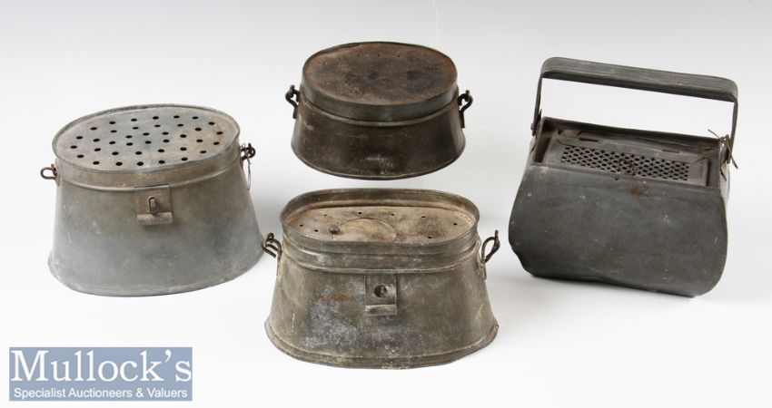 Selection of live bait kettles varying sizes and styles one marked Raveau to bottom, 3x oval shapes and 1x oblong shaped, individually no more than 20cm in length, with hinged lids (4)