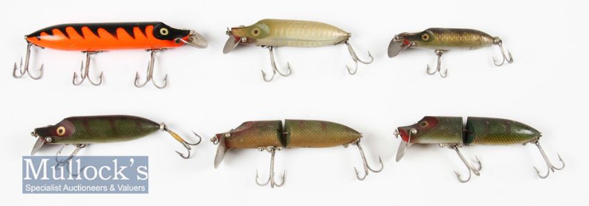 6x ABU Hi-Lo Swedish made plug baits most with maker’s marks, from 2 ½” to 4” examples