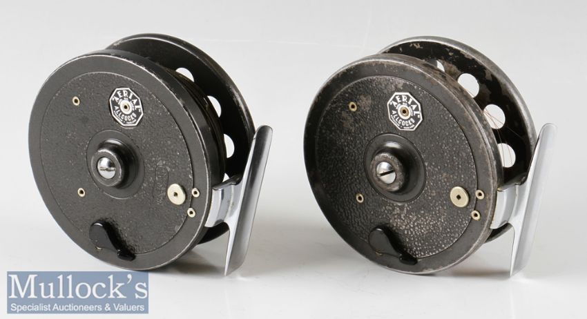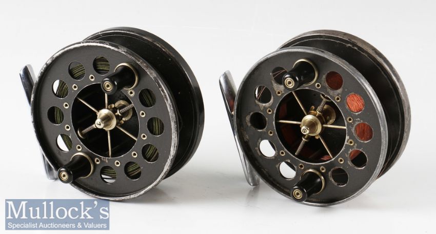 2x Allcocks Aerial 3 ¾” centre pin reels in black finishes, six spoke, perforated faces, chrome feet and twin handled, some wear, both spin very well (2)