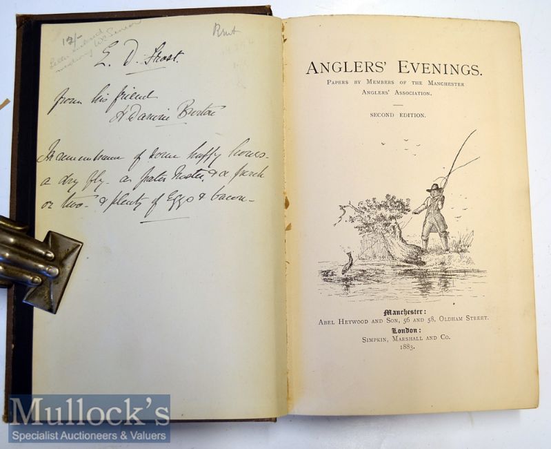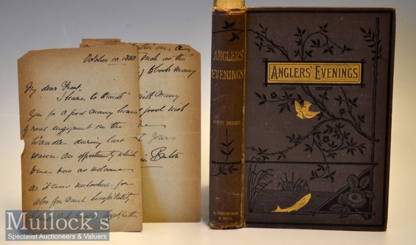 Late 19th c Fishing Book and Letter – titled “Anglers Evenings - Papers by Members of The Manchester Angler’s Association” 2nd ed 1883 publ’d Manchester and London in the original pictorial brown cloth and gilt boards and spine (usual shelf wear to top and tail), weak front hinge – clean internally comes hand written letter dated October 10 1888 with reference to W Senior, fishing on The Wardle, perch et al