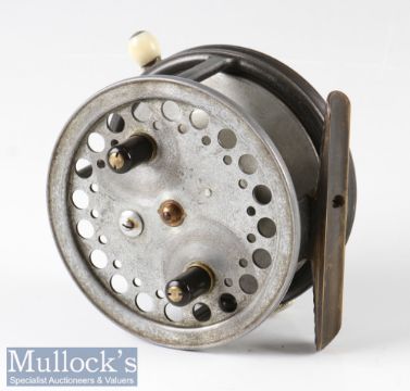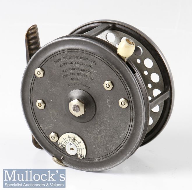 Hardy Bros England 3 ¾” extra wide super silex casting reel brass ribbed foot, twin handles, marked J.B.W internally, ivorine check lever, light wear, runs good overall