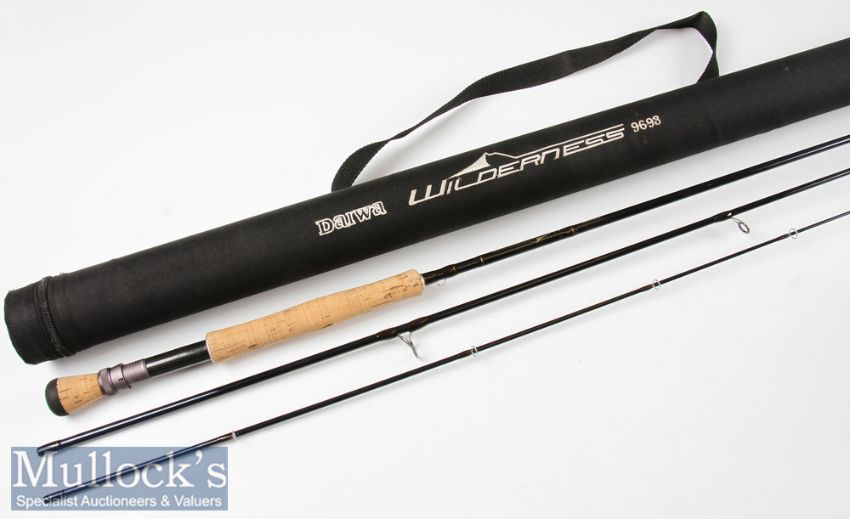 Fly Rod: Diawa The Wilderness Mod. No 9693 Carbon rod – 9ft 6in 3pc line 9# fuji style lined butt guide – lightly soiled cork handle fitted with woven carbon and screw locking winch fittings – c/w makers cloth bag and matching black cordura rod tube – lightly used (G)