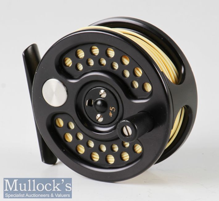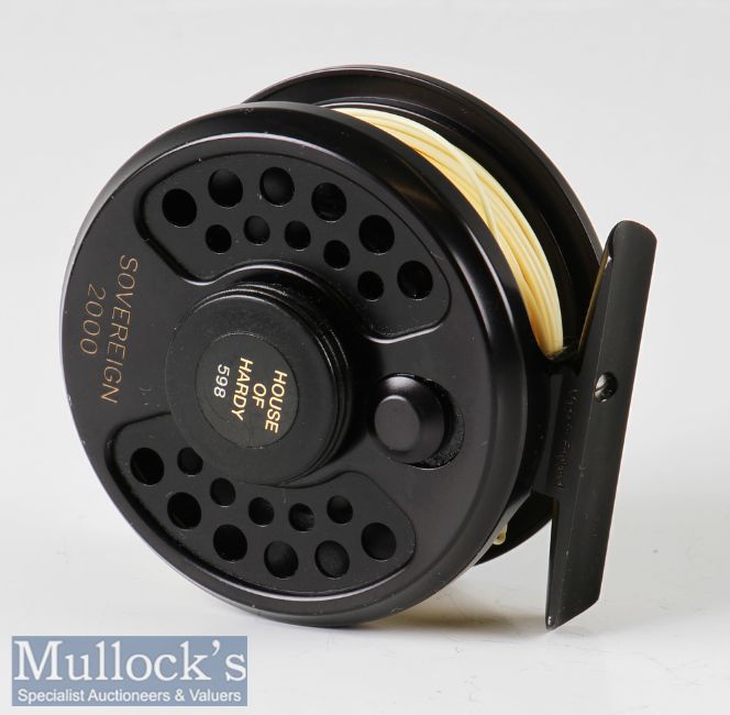 Fine Hardy Bros England Sovereign 2000 #5 fly reel edition 598, disc drag, on/off check, counter weight with spare spool, both loaded with line, with maker’s neoprene case and boxes (2)