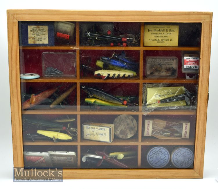 Assorted Fishing accessories to include Devon Minnows with Hardy noted, Milward Eel Hooks with cases, Braddell & Son box, Poole & Son box, Hardy box, Hardy’s Cerolene, Cero silk line, all in wooden cabinet
