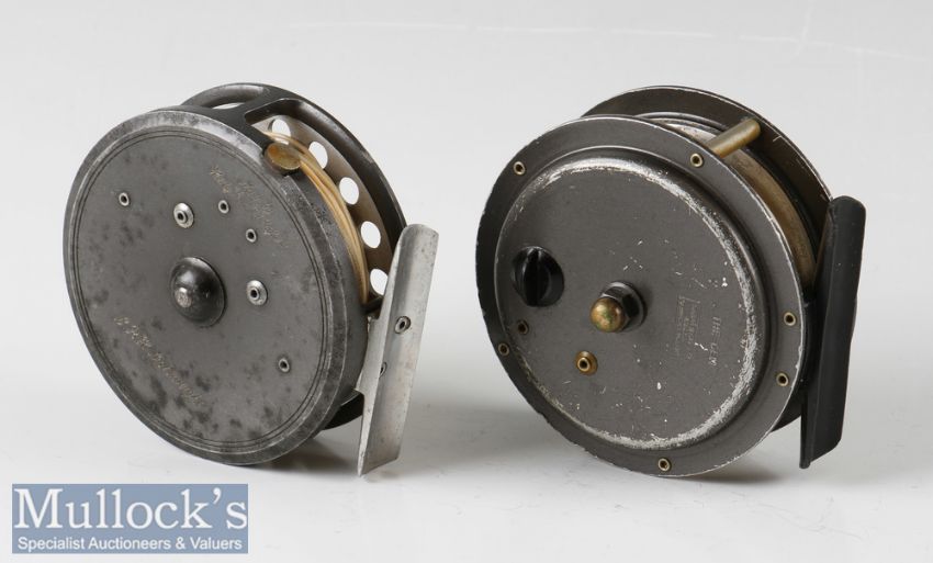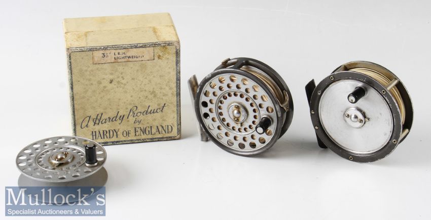 Hardy Bros England 3 1/8” LRH Lightweight alloy fly reel with spare spool an alloy foot, rim tensioner, line guide, quick release latch and maker’s box together with a Hardy 3 3/8” Gem model fly reel (3)