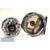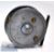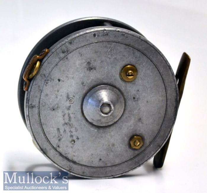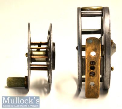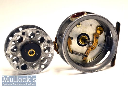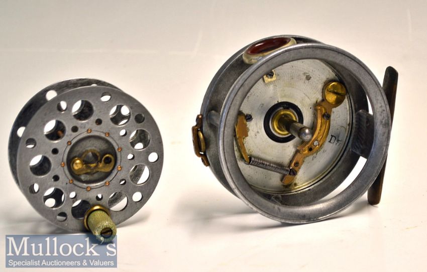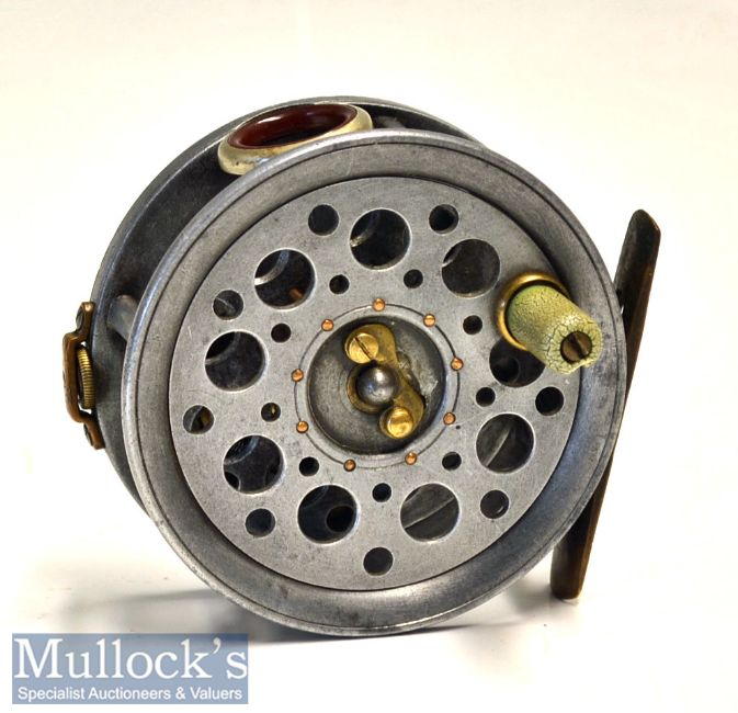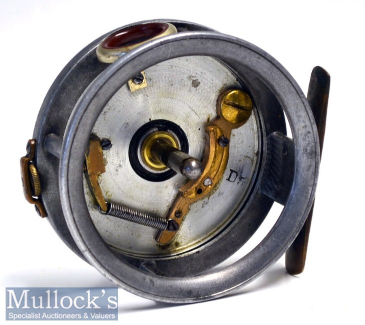 Rare and interesting W H Dingley left hand wind silent check 3.25” alloy fly reel – c/w red agate line guide, smooth perforated brass foot Possibly replaced), the inside back plate stamped D5 – fully perforated spool, with brass pillar drum core - fitted with telephone screw latch, brass bridge over rim tension regulator – crazed ivorine handle (tiny chip) – turns freely – one off!!