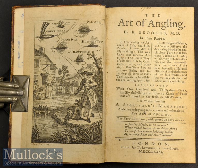 Early Fishing Book from late 18th c: Brookes, R – “The Art of Angling” 5th ed publ’d London 1781 – original half leather and marble boards – edges and hinge wear from age, engraved frontis plus 135 wood cuts describing the different kinds of fresh and saltwater fish – internally very clean – library blue stamp mark to the front free end plate – overall (G) for a 240yr old book.