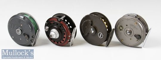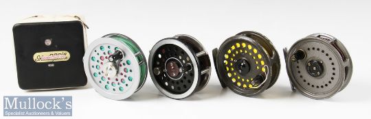 Various fly reels to include a 3 3/8” Martin Reel & Co model MG7/5S together with a Noris Shakespeare Speedex 3 ½” reel with makers zip case together with a K P Morritt Intrepid 3 5/8” reel and a Youngs Beaudex 3 ½” reel – all with light signs of wear, run smooth otherwise (4)