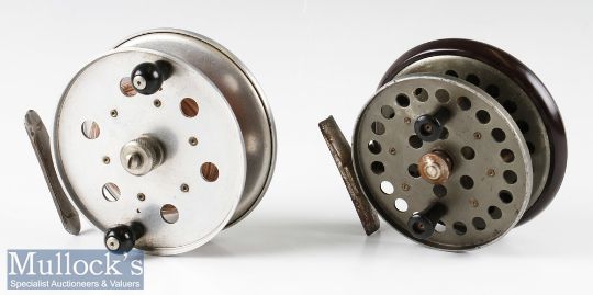 Allcocks 4 ½” Sea Knight centre pin reel twin handled, on/off check button working but loose, together with a 4” DAM Ever Ready centre pin with bakelite back, alloy drum, on/off check – both spin well (2)
