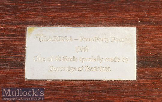 The Clarissa Carp Rod - Fine unused Partridge, Redditch “Clarissa Four/Forty Four” split cane ltd ed commemorative carp rod in presentation red stained wooden rod case c1988 - 10ft 2pc split cane carp rod ltd ed no.24/44 c/w recipients name – amber lined bridge guides throughout, wrapped ochre tipped black - sliding aluminium reel rings - 26in cork handle – comes in original makers wooden rod box with engraved brass plaque and makers original fitted cloth bag c/w spare ferrule stopper in the its own compartment