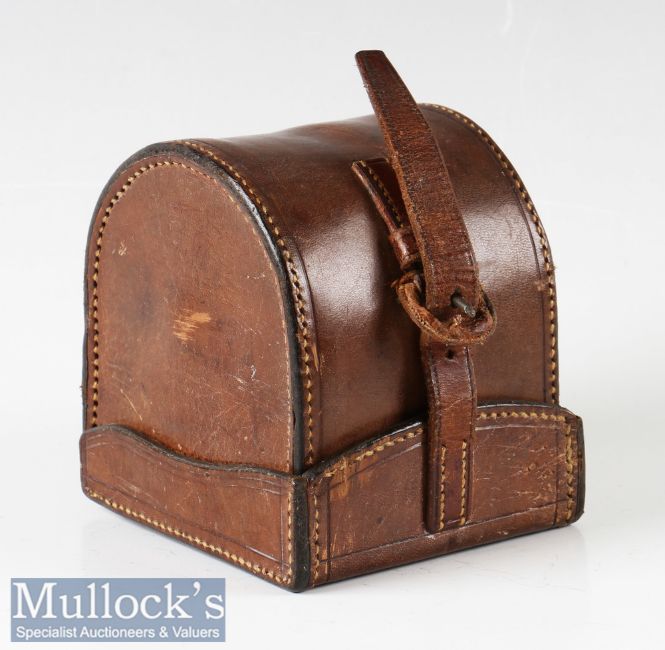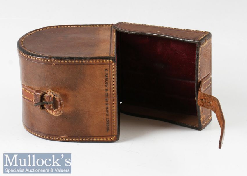 C Farlow London leather D block reel case internally measures 3” length, 1.5” width, good strap, dark red velvet lining