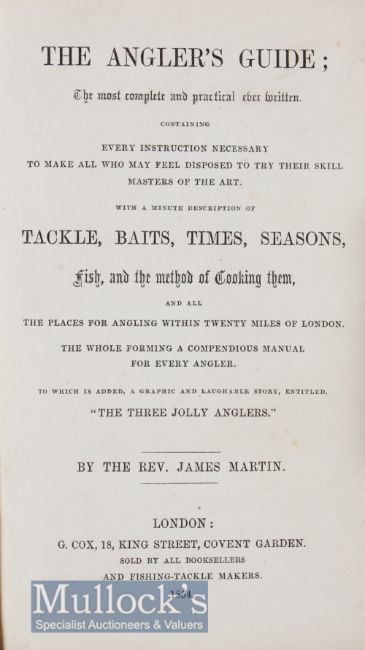 Early 1850s Anglers Guide Fishing Book: James, Rev Martin - “The Anglers Guide; The most complete and practical ever written and a minute description of Tackle, Baits, Times, Seasons et al” 1st ed 1854 publ’d London – in the original embossed binding with gilt to spine – (lightly faded) – c/w frontis – see chapter titled “The Three Jolly Anglers” a graphic and laughable story - dust stained closed pages – otherwise overall clean (G)